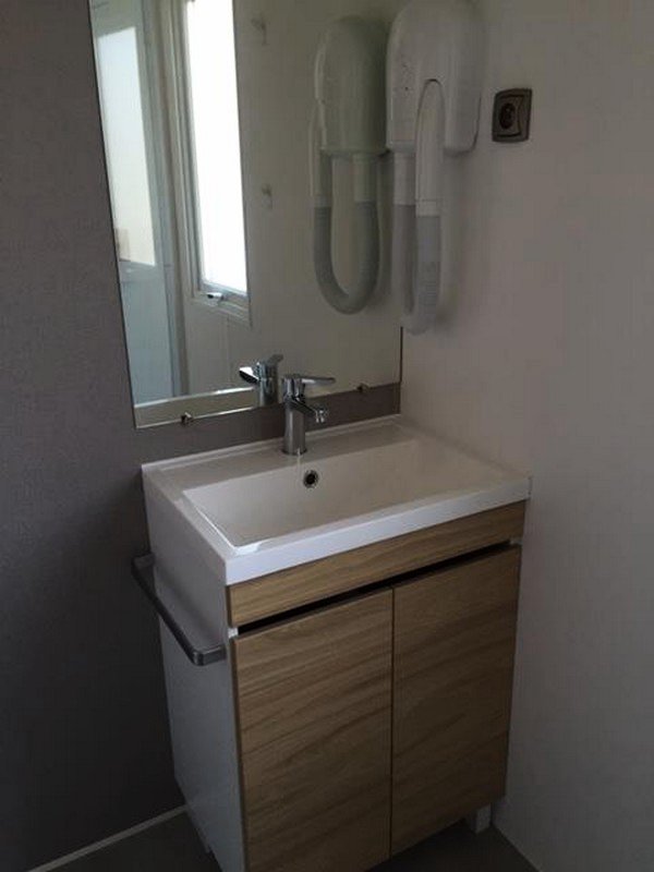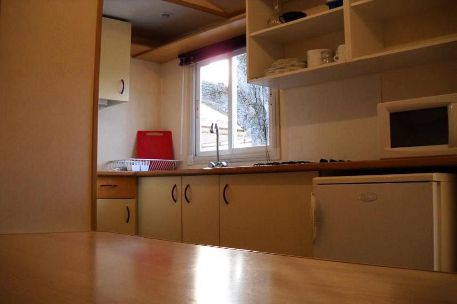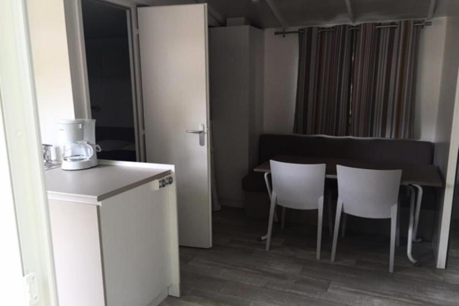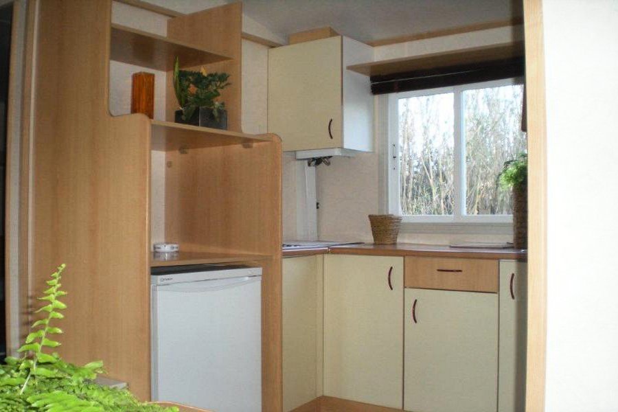 Le Mobil Home comprend une cuisine équipée avec évier, réfrigérateur, 1 plaque de cuisson 4 feux, 1 micro-onde, 1 hotte aspirante, 1 cafetière électrique. Le logement dispose également d'un accès wifi et du chauffage électrique.