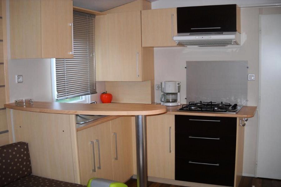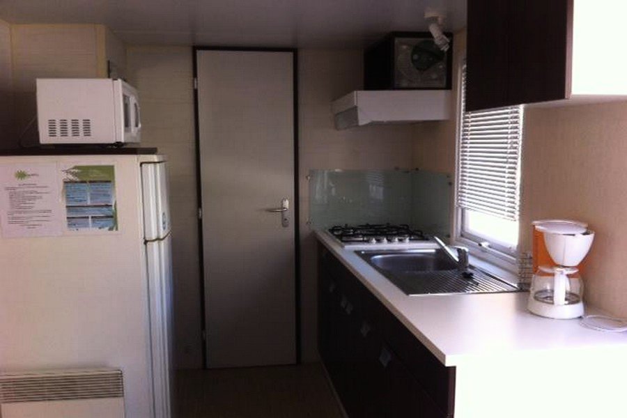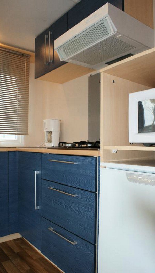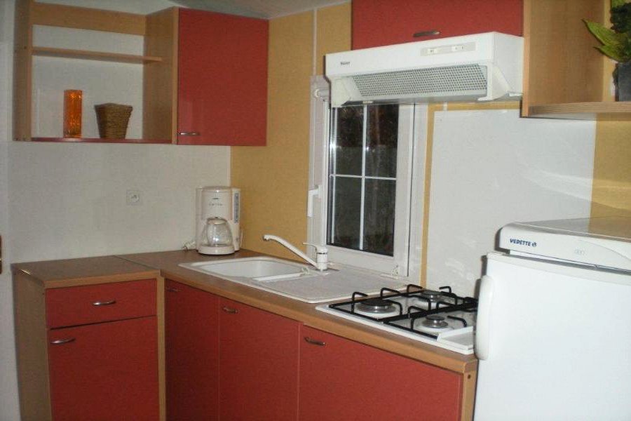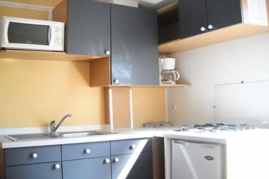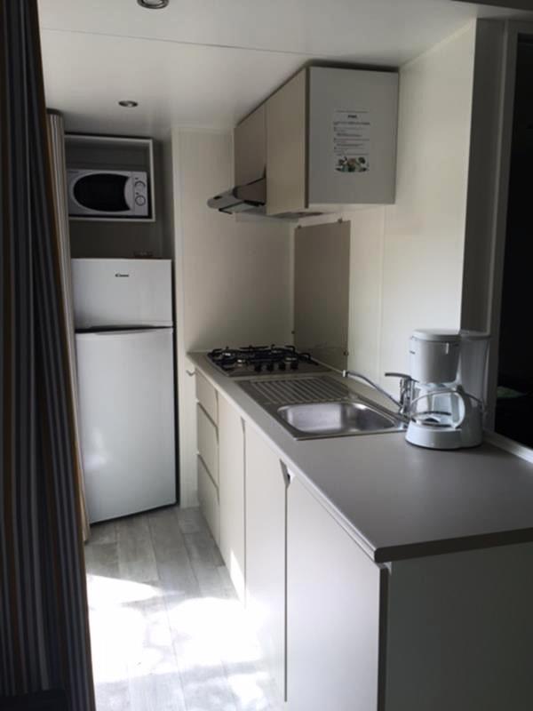 Le Mobil Home comprend une cuisine équipée avec évier, réfrigérateur, 1 plaque de cuisson 4 feux, 1 micro-onde, 1 hotte aspirante, 1 cafetière électrique.