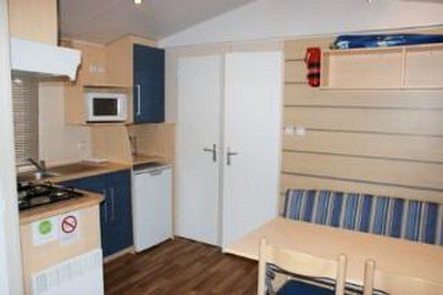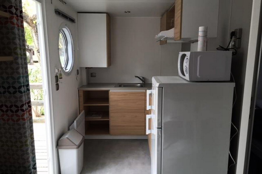 Le Mobil Home comprend une cuisine équipée avec réfrigérateur, congélateur, micro-ondes.