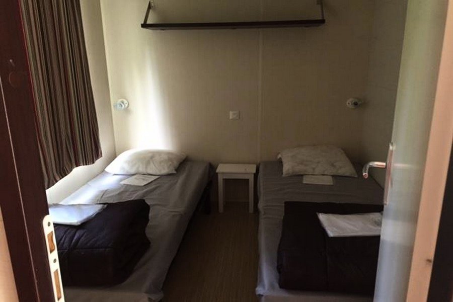 Classic Eco Annexe camping 4 Personnes de 22m² composé d'une chambre avec 1 lit 2 personnes, d'une chambre avec 2 lits 1 personne, d'une cuisine équipée, d'une salle de bains avec douche, lavabo et WC séparé.
