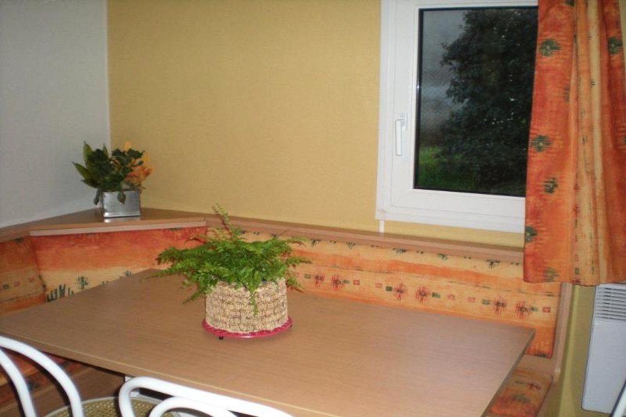 Le Mobil Home comprend une cuisine équipée avec évier, réfrigérateur, congélateur, 1 plaque de cuisson 4 feux, 1 micro-onde, 1 hotte aspirante, 1 cafetière électrique, vaisselle et couverts adaptés au nombre de personnes. Le logement dispose également d'une terrasse semi-couverte.