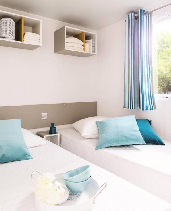 Mobil Home Grand Confort Cottage 4/6 Personnes de 28m² composé d'une chambre avec un lit 2 personnes, d'une chambre avec 2 lits 1 personne, d'une banquette lit 2 personnes, d'une cuisine équipée, d'une salle de bains avec douche et WC séparé.