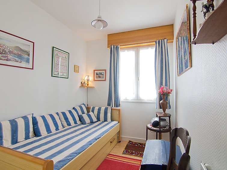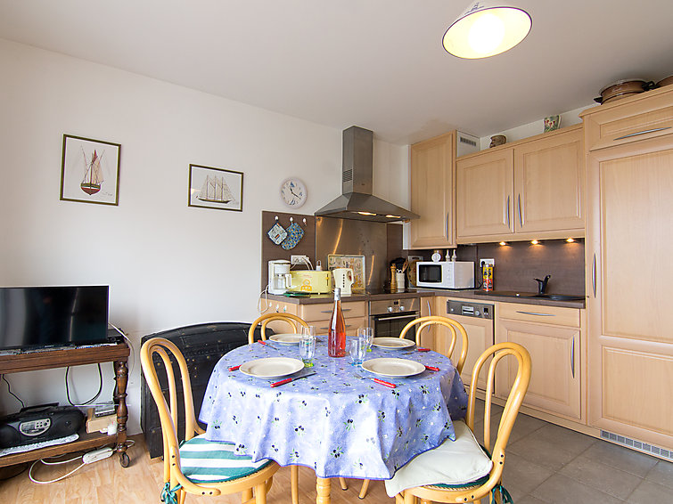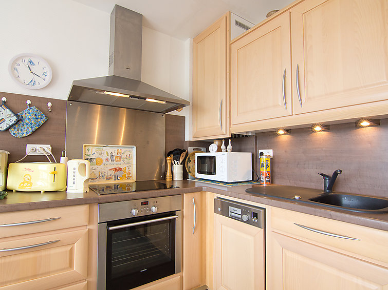Apt 2 pièces 29 m2 au 1er étage. Aménagement fonctionnel et agréable: séjour/salle à manger avec TV. Sortie sur le balcon. 1 chambre avec 1 lit gigogne (2 pers.). Cuisine ouverte (2 plaques de cuisson, four, lave-vaisselle, four micro-ondes, cafetière électrique). Douche/WC. Balcon 6 m2. Mobilier de balcon. A disposition: lave-linge, fer à repasser.