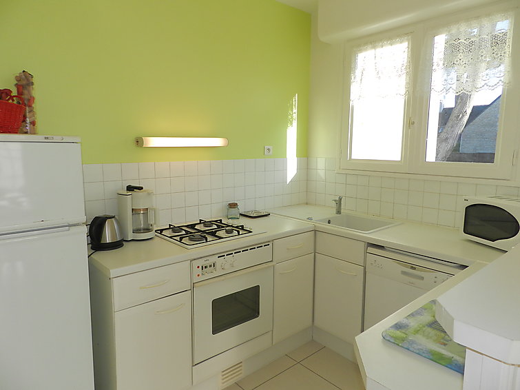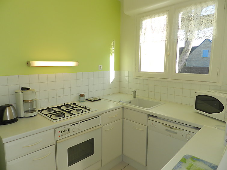 Apt 4 pièces 68 m2, au rez-de-chaussée. Aménagement confortable et agréable: séjour/salle à manger avec TV. Sortie sur le jardin, orientée est. 1 chambre avec 2 lits (90 cm). 1 chambre avec 2 lits (90 cm). 1 chambre avec 1 grand-lit (140 cm). Cuisine ouverte (4 plaques de cuisson, four, lave-vaisselle, four micro-ondes, congélateur). Douche, WC séparé. Chauffage au gaz. Terrasse 10 m2. Meubles de terrasse, barbecue. A disposition: lave-linge, fer à repasser.