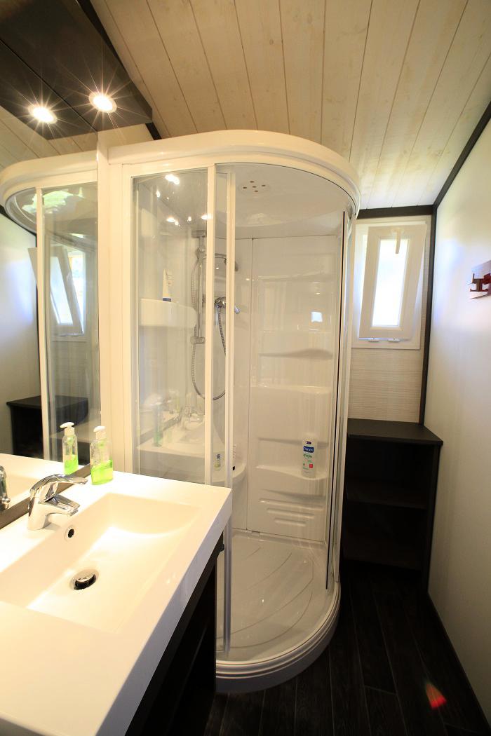 Chalet récent de 35m² pour 6 personnes, composé d'une cuisine équipée, d'un séjour très spacieux avec une banquette-lit pour 2 personnes, d'une chambre avec un lit double et possibilité d'ajouter un lit bébé, d'une seconde chambre avec 2 lits simples et un lit superposé, d'une salle de bains avec une douche, des WC et une terrasse de 15m².