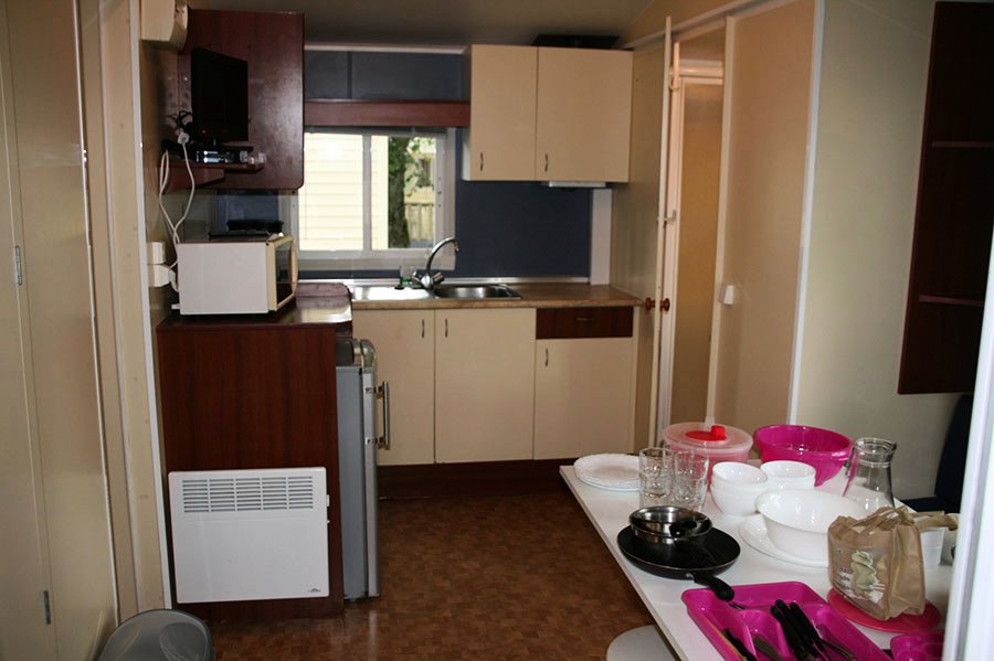 Le mobil home comprend un coin cuisine équipée avec réfrigérateur, micro-ondes, cafetière, oreillers, alèses, ustensiles de cuisine et vaisselle adaptée au nombre de personnes.
