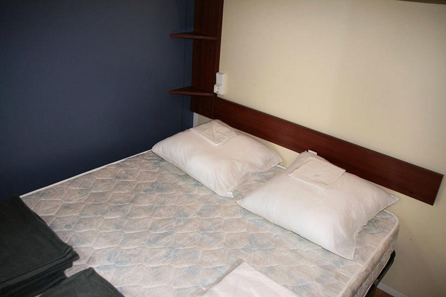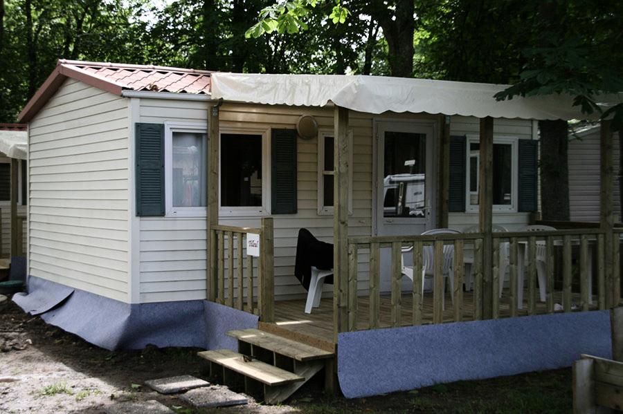Mobil Home 3 Pièces 4 Personnes composé d'un coin cuisine équipé, d'une chambre avec 1 lit double, d'une chambre avec 2 lits simples, d'une salle de douche avec WC. Terrasse semi-couverte.