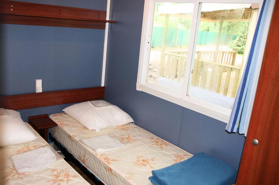 Mobil Home 3 Pièces 4 Personnes d'environ 30m² composé d'un coin salon, d'un coin cuisine équipée, d'une chambre avec 2 lits simples, d'une chambre avec 1 lit double, d'une salle d'eau avec WC. Terrasse. A noter: Linge de lit et de toilette non fournis.