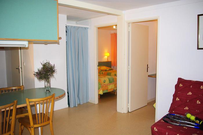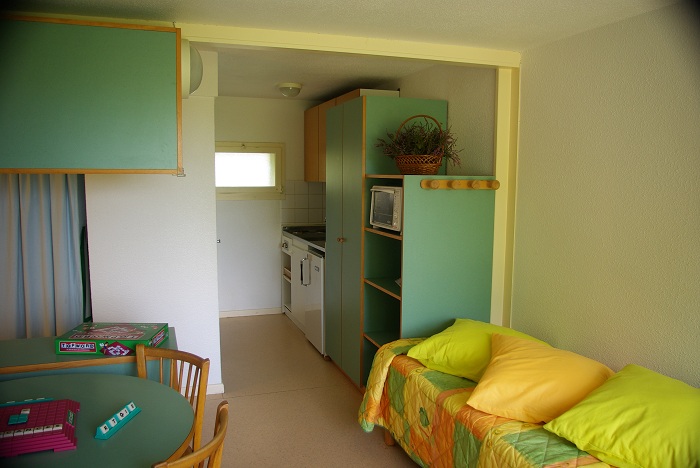 Pour avoir plus de détails et réserver cet hébergement, choisissez une date ci-dessus et cliquez sur voir l'offre ! Vous serez redirigé vers le site proposant la location.40 m² Séjour-chambre avec banquette-lit (140) Espace cuisine Chambre à 2 lits simples (80) Chambre à 2 lits simples (80) Salle d'eau, WC non séparés Terrasse + mobilier de jardin Ajout 2 lits bébé possible : dans chaque chambre