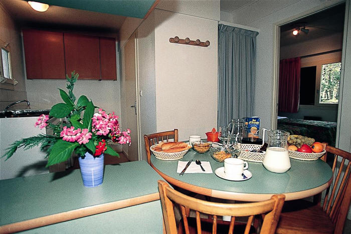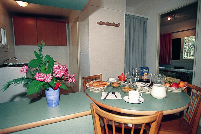20 m² Séjour-chambre avec banquette-lit (140) + 1 lit simple (80) Espace cuisine Salle d'eau, WC non séparés Terrasse + mobilier de jardin Ajout lit bébé possible : dans le séjour