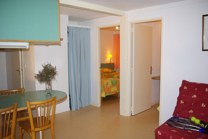 Appartement de 31m² pour cinq personnes comprenant un séjour chambre avec deux lits simples, une chambre avec deux lits simples plus 1 lit superposé, une salle d'eau avec douche lavabo et des toilettes séparés.