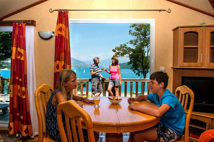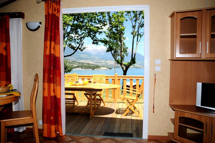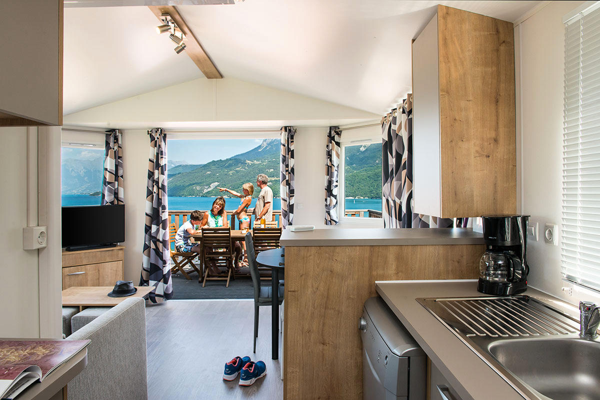 Le coin cuisine est équipé d'un réfrigérateur/ congélateur, de plaques de cuisson, d'une hotte aspirante, d'un four à micro-ondes et d'un lave-vaisselle.Ustensiles et vaisselle pour 4 personnes.Le chalet comprend aussi : une climatisation réversible et une télévision à écran plat.Terrasse avec salon de jardin (vue sur le lac).Le linge de lit et de toilette ne sont pas inclus. Location possible sur place.
