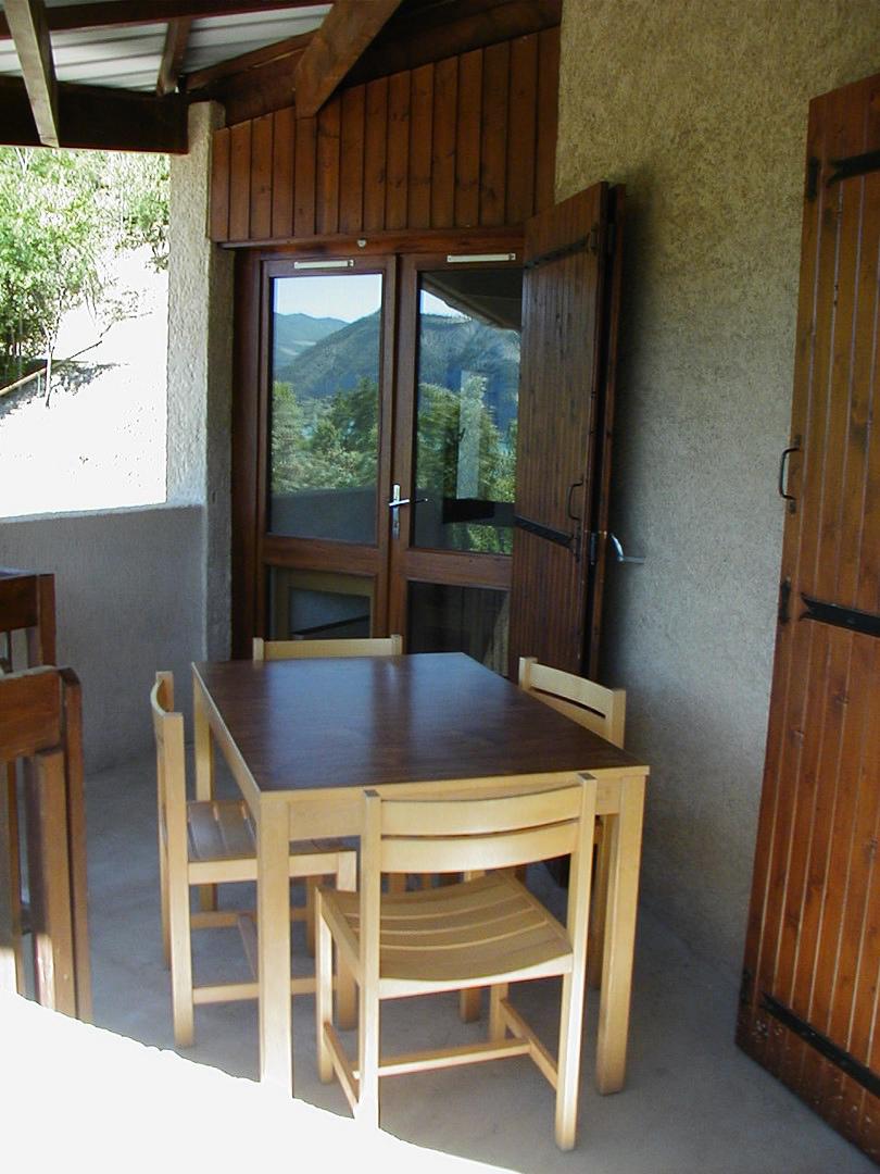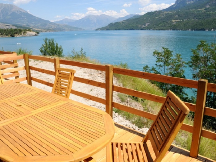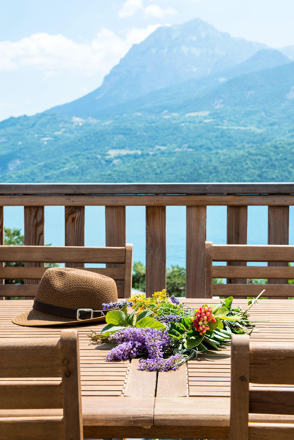 Terrasse avec salon de jardin (avec vue sur le lac).