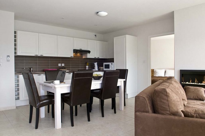 Le coin cuisine est équipé avec un réfrigérateur - congélateur, des plaques de cuisson, une hotte aspirante, un four à micro-ondes et un lave-vaisselle.