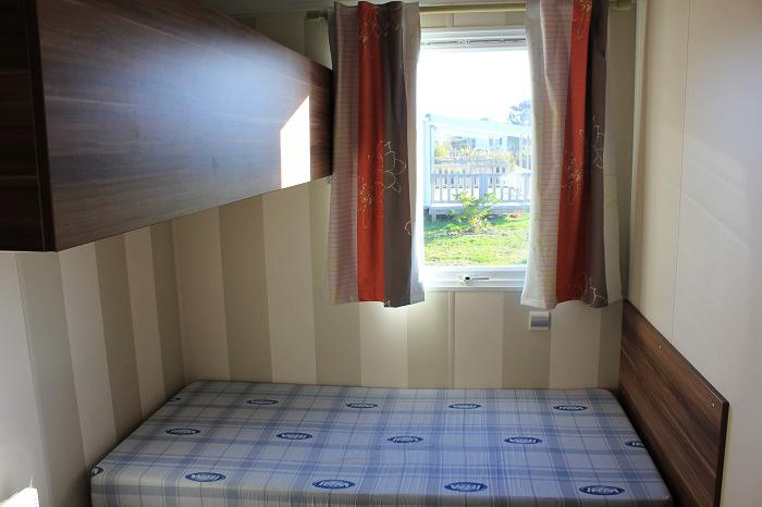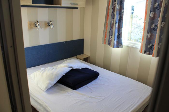Mobil-home 3 pièces pour 4 personnes de 25m² composé d'un séjour avec un coin repas, d'une kitchenette équipée, d'une chambre avec un lit double, d'une seconde chambre avec deux lits simples, d'une salle de douche avec WC intégrés et d'une terrasse. A noter : interdiction de fumer dans le mobil-home.