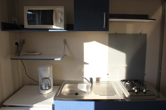 Le mobil-home comprend une kitchenette équipée d'un réfrigérateur, de plaques de cuisson au gaz, d'un micro-ondes, d'une cafetière électrique et de tous les ustensiles de cuisine et vaisselle. La terrasse inclut le mobilier de jardin et un parasol.