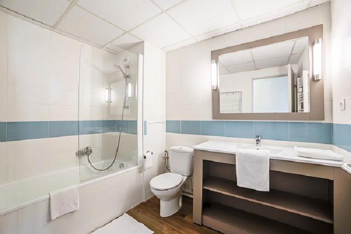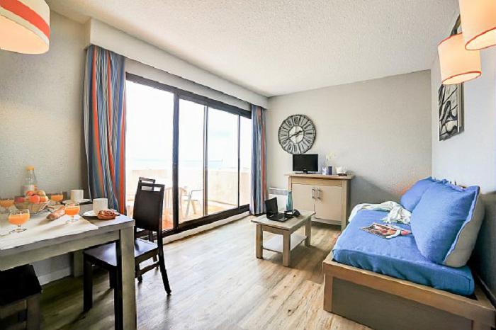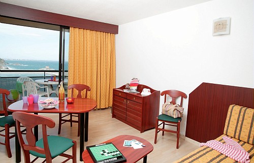 Studio 4 personnes d'environ 30m² comprenant un séjour avec 1 lit 2 places et 2 lits superposés, une salle de bain avec baignoire ou douche, des toilettes, une kitchenette et un balcon vue mer.A noter : Le couchage en hauteur ne convient pas aux enfants de moins de 6 ans.