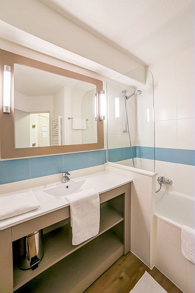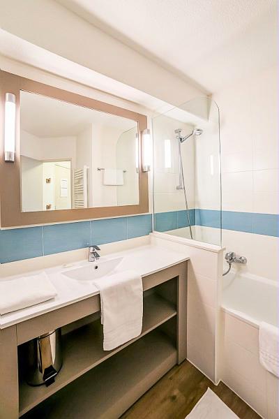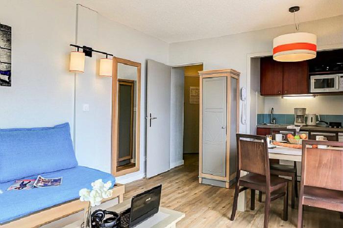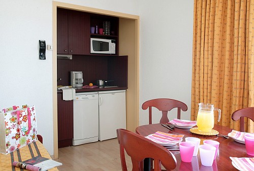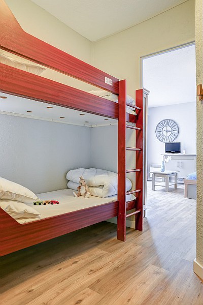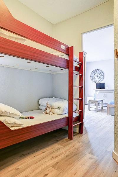 Studio 4 personnes d'environ 30m² comprenant un séjour avec 1 canapé convertible 2 places et un coin cabine avec 2 lits superposés, une salle de bain avec baignoire ou douche, des toilettes, une kitchenette. A noter : Le couchage en hauteur ne convient pas aux enfants de moins de 6 ans.