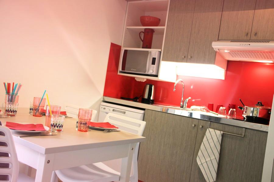 Appartement de deux pièces pour 5 personnes de 34m² plus 9.5m² de terrasse composé d'un séjour- chambre avec deux lits simples et d'une cheminée, d'une chambre avec mezzanine avec trois lits simples (1 lit au RDC et 2 lits en mezzanine), d'une kitchenette équipée et d'une salle d'eau (douche, lavabo) avec toilettes.