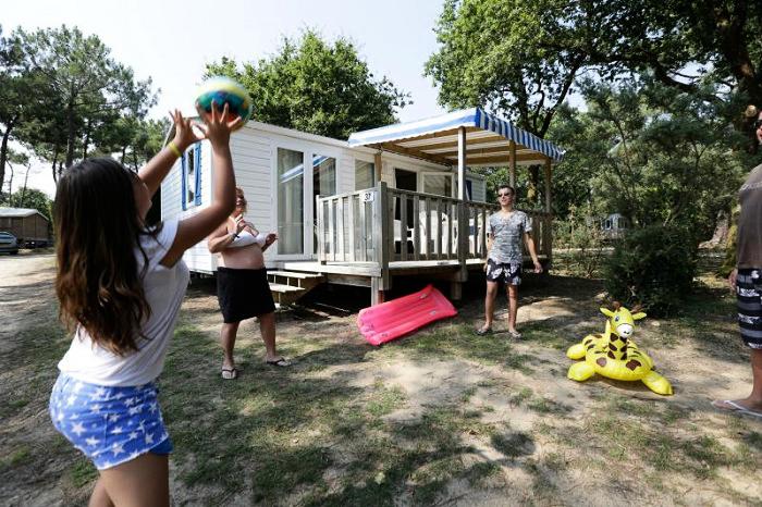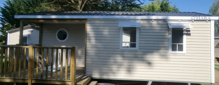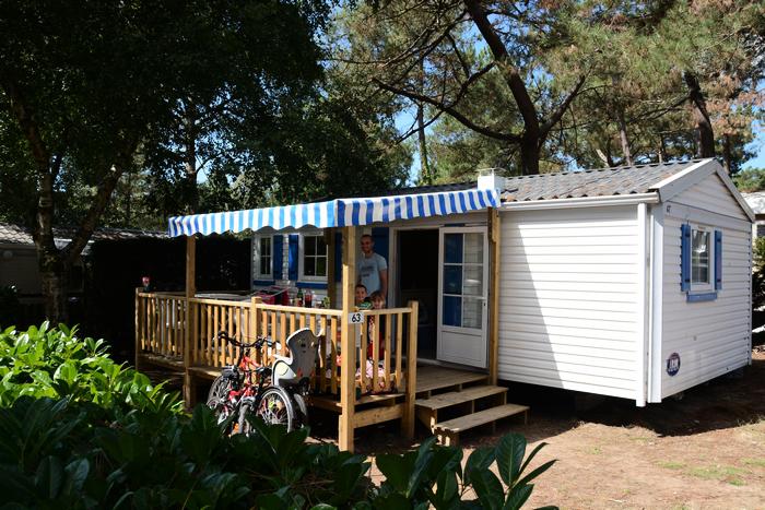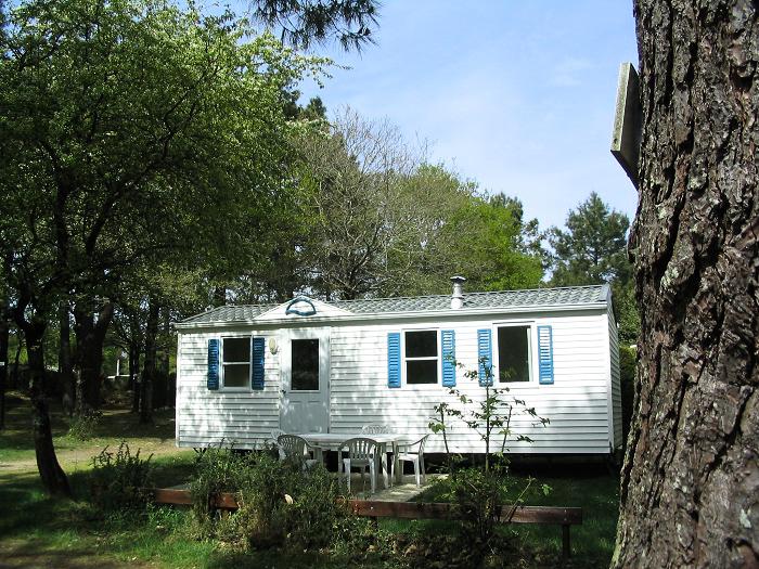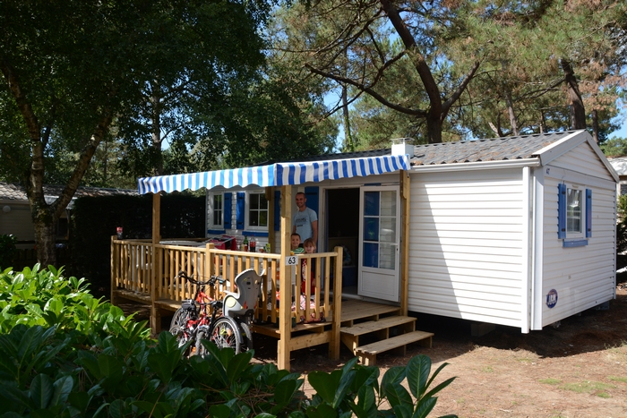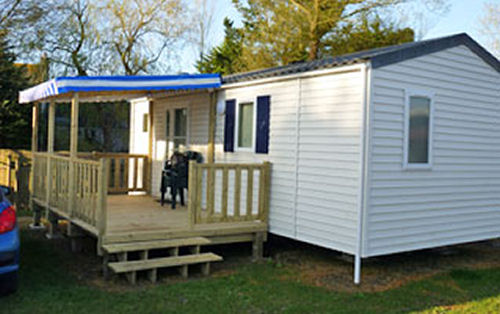 Mobil Home pour 6 personnes de 30m² composé d'une chambre avec 1 lit double, une chambre avec 2 lits simples, un salon/salle à manger avec couchage d'appoint pour 2 personnes, une cuisine équipée, une salle de douche et des WC séparés. Le logement dispose également une terrasse semi-couverte. Possibilité de 5e et 6e personne, supplément de 35€r / personne à régler sur place.