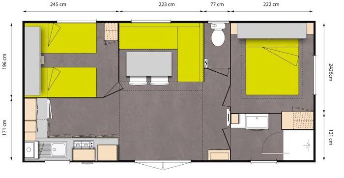 Mobil Home 6 personnes de 24m² composé d' une chambre avec 1 lit double, une chambre avec 2 lits simples, un salon/salle à manger avec couchage d'appoint pour 2 personnes, une cuisine équipée, une salle de douche et de WC séparés. Possibilité de 5e et 6e personne, supplément de 5€ / jour / personne à régler sur place