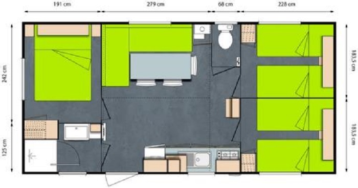 Mobil Home 4/5 personnes de 30m² composé d' une chambre avec 1 lit double, une chambre avec 2 lits simples, un salon/salle à manger avec couchage d'appoint pour 1 personne, un coin cuisine, une salle de douche et des WC séparés.