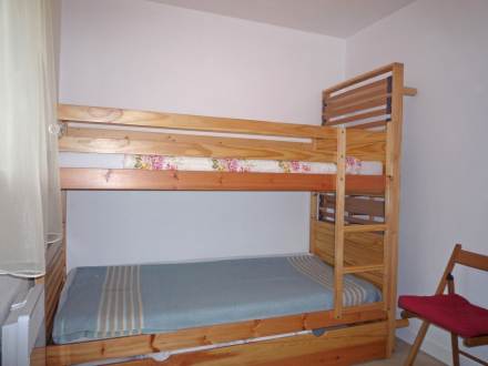 Apt 2 pièces 33 m2 au 1er étage: séjour/salle à manger avec 1 divan-lit double (160 cm), TV, radio et DVD. 1 chambre avec 1 x 2 lits superposés (80 cm). Cuisine (4 plaques de cuisson, four, four micro-ondes). Douche/WC. Chauffage électrique. Terrasse 10 m2, situation est. Meubles de terrasse. A noter : Canapé-lit BZ neuf épaisseur 15cm.