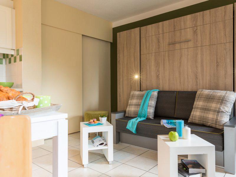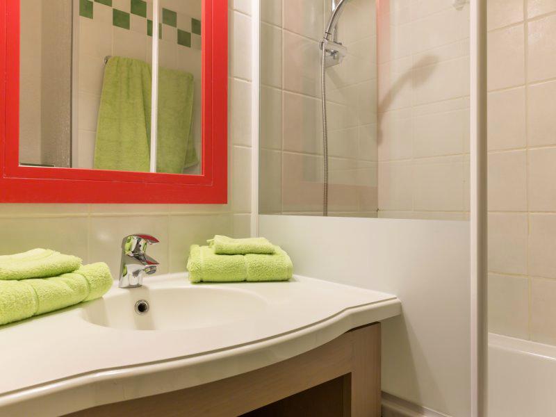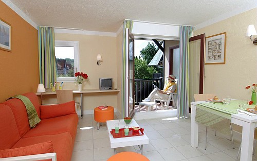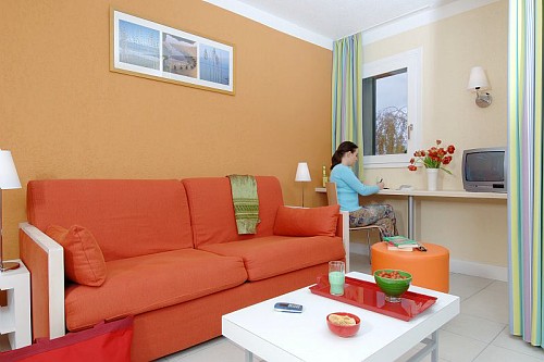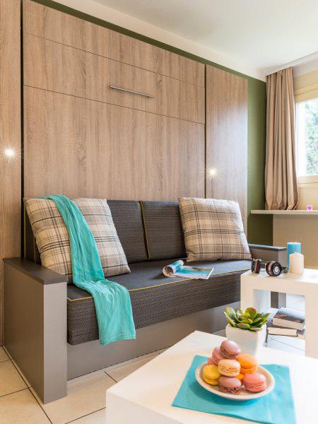 Studio pour 4 personnes de 25m² comprenant un séjour avec 1 canapé lit convertible (2 couchages), une entrée avec 2 lits superposés séparée du séjour par une porte, une salle de bain avec toilettes, un coin cuisine équipé, un balcon ou une terrasse. A noter : Le couchage en hauteur ne convient pas aux enfants de moins de 6 ans.