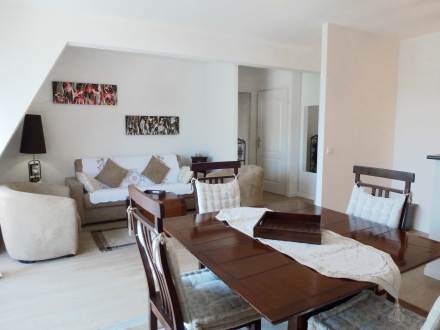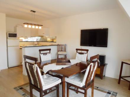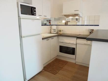 Apt 2 pièces 45 m2 au 3ème étage: séjour/salle à manger avec 1 divan-lit (140 cm), TV (écran plat). 1 chambre avec 1 lit (160 cm). Cuisine ouverte (3 plaques de cuisson, four, lave-vaisselle, four micro-ondes, congélateur, cafetière électrique). Salle de bains, WC séparé. Balcon 3 m2, situation sud. Vue sur les alentours. A disposition: lave-linge. Place de parking.