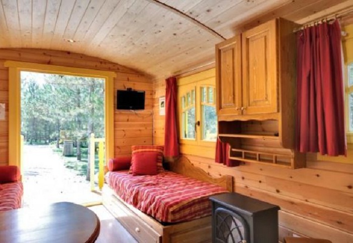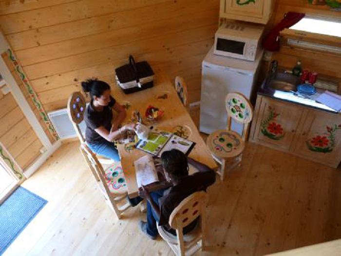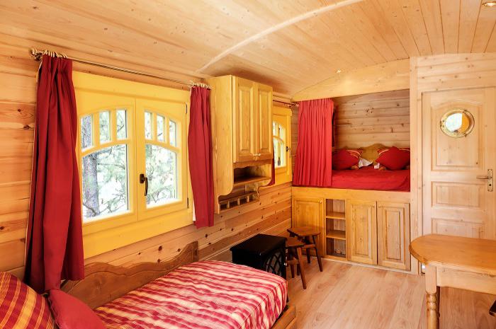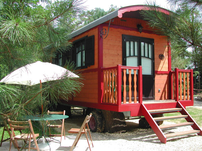 Roulotte fixe de 24m² pouvant accueillir 5 personnes. Elle est composé d'un séjour avec un lit double en alcôve, 2 banquettes lits et un lit tiroir, d'un coin repas, d'une cuisine équipée, d'une salle de bain avec douche et WC non séparé. Pour des raisons de sécurité, les logements sont non-fumeur.