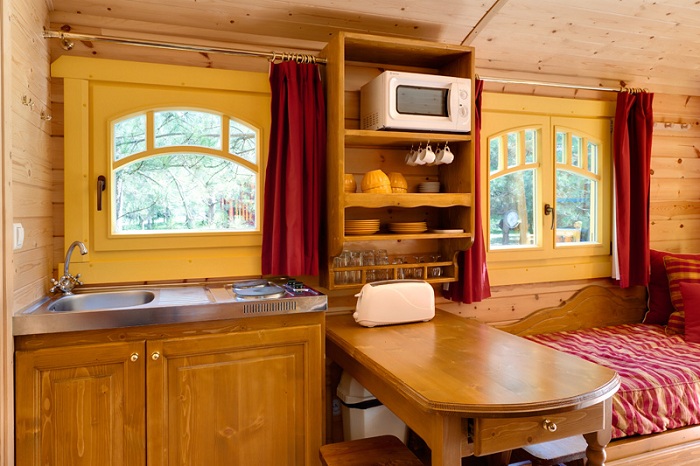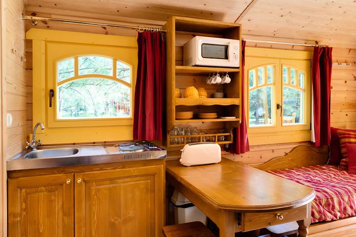 La roulotte comprend un séjour avec télévision, une cuisine équipée avec réfrigérateur avec compartiment freezer, 2 plaques électriques, four micro-ondes, grille-pain, cafetière et vaisselle pour 5 personnes.