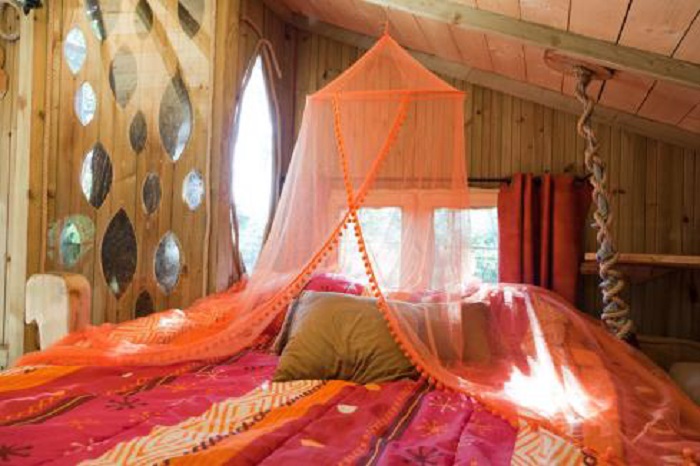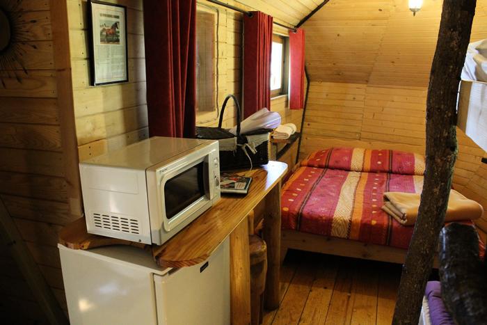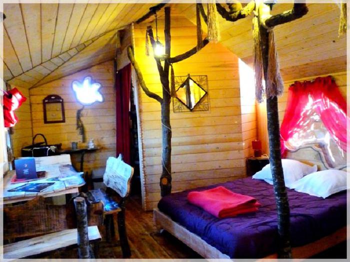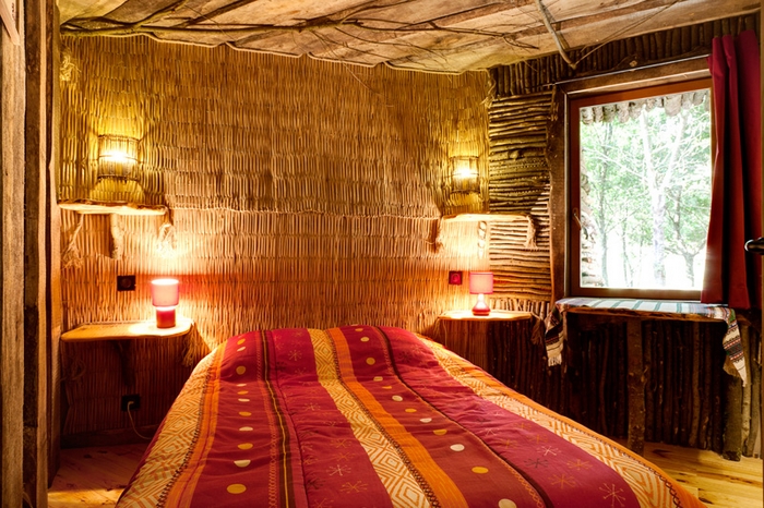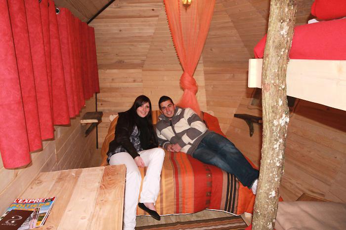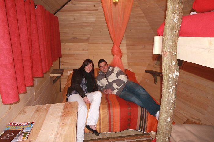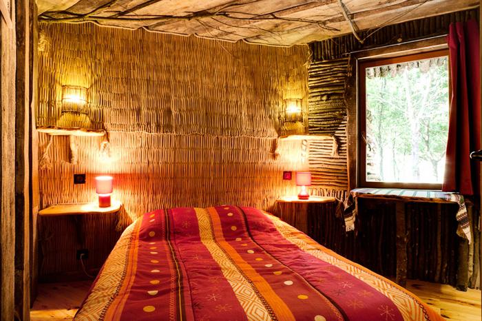 Cabane Dans Les Arbres 4 Personnes composée d'un lit double et de 2 lits superposés, de toilettes sèches (sans eau avec de la sciure). A noter : la cabane ne possède ni eau courante ni sanitaires. Les douches et sanitaires sont situés à proximité.