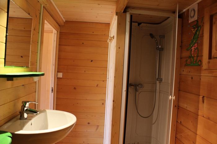 Roulotte fixe de 21m² pouvant accueillir 4 personnes.Elle est composé d'un séjour avec 1 lit tiroir pour 1 personne, d'un coin repas et cuisine équipée, d'un lit double, de deux lits simples et d'une salle de bain avec lavabo, douche et WC non séparé.Pour des raisons de sécurité, les logements sont non-fumeur.