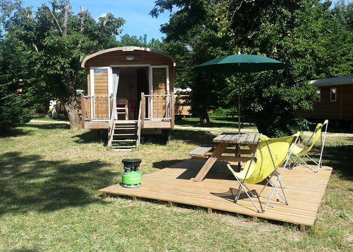 Roulotte 4 Personnes, de 21m² composée d'un espace de vie, d'un coin cuisine équipé, d'un espace nuit avec 2 parties: côté parents avec 1 lit double et côté enfants avec 2 lits superposés, d'une salle de bains avec douche avec WC.