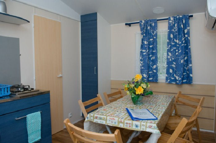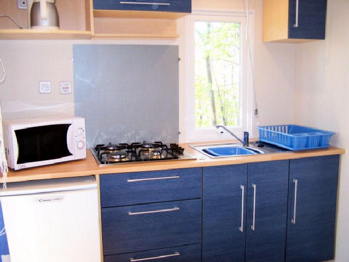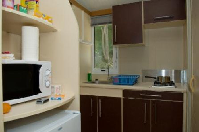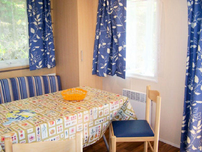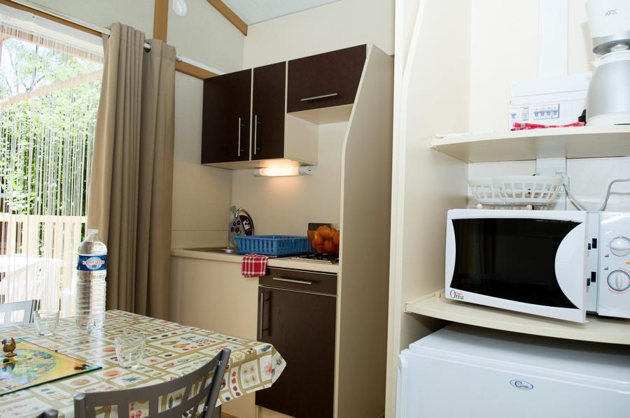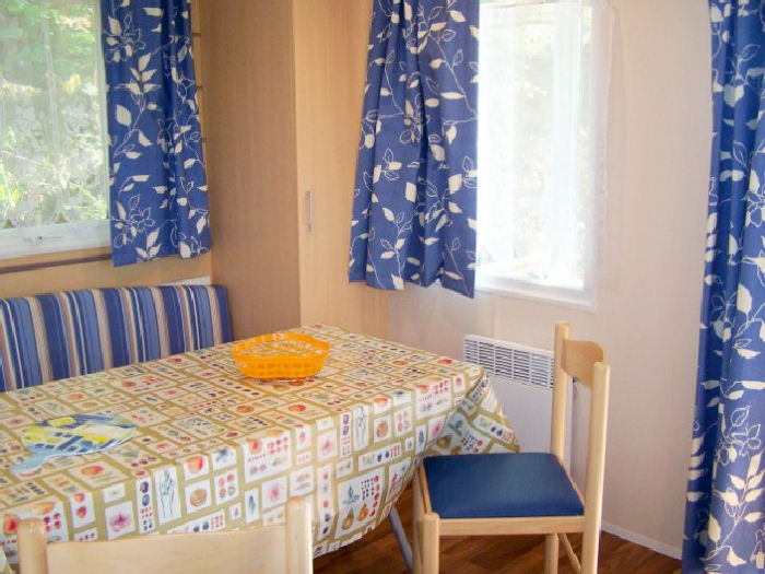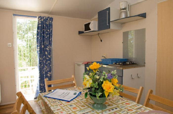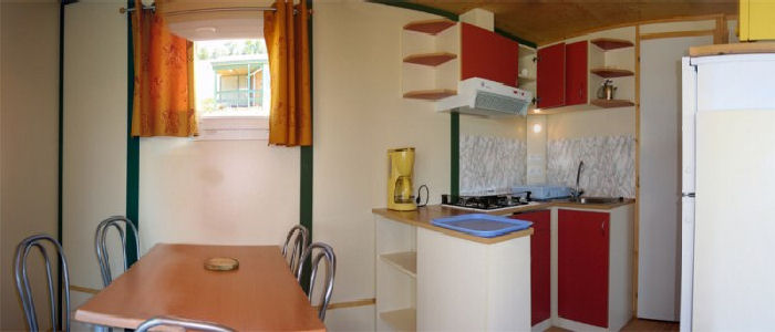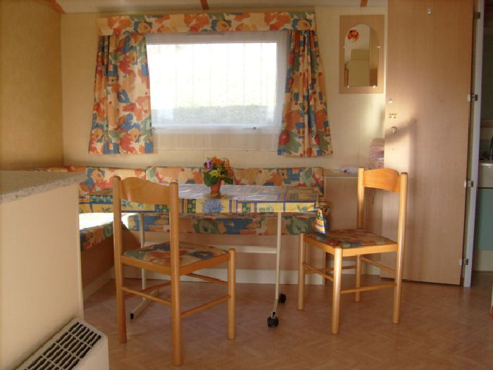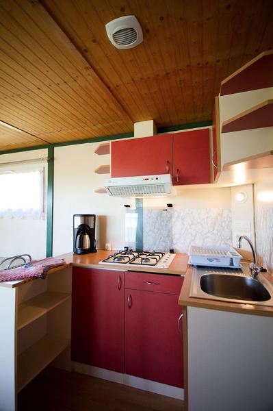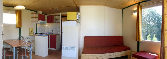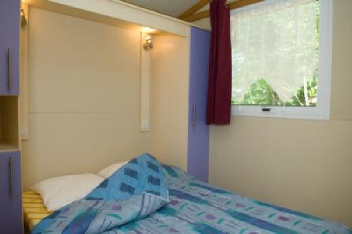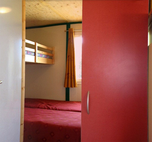 Chalet de 24m² pour 5 personnes, composé d'un coin cuisine équipé, d'un séjour avec coin repas, d'une chambre avec un lit double, d'une chambre avec 2 lits superposés et un lit simple, d'une salle de bains avec une douche et un WC et d'une terrasse.Ancienneté : 2003 et 2008.