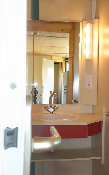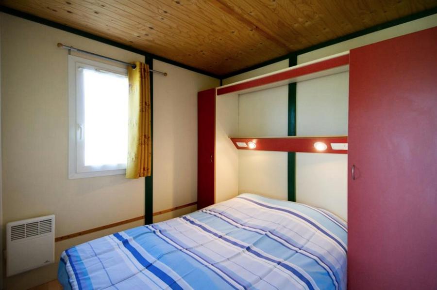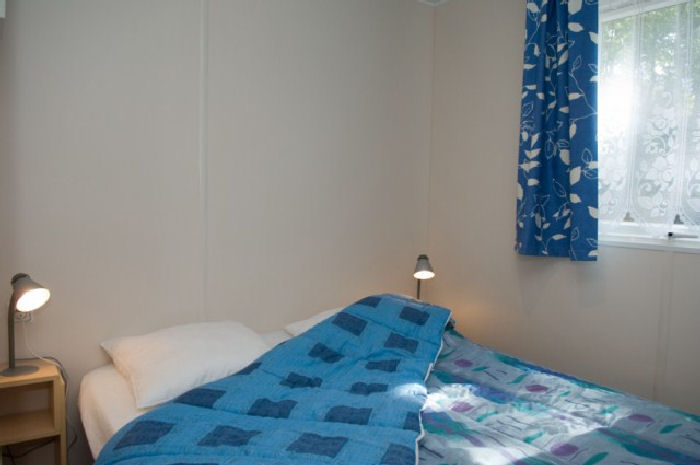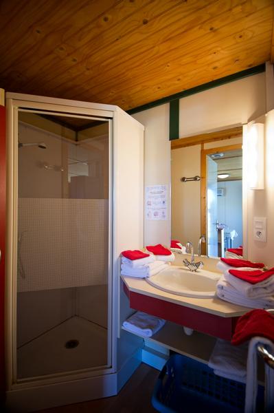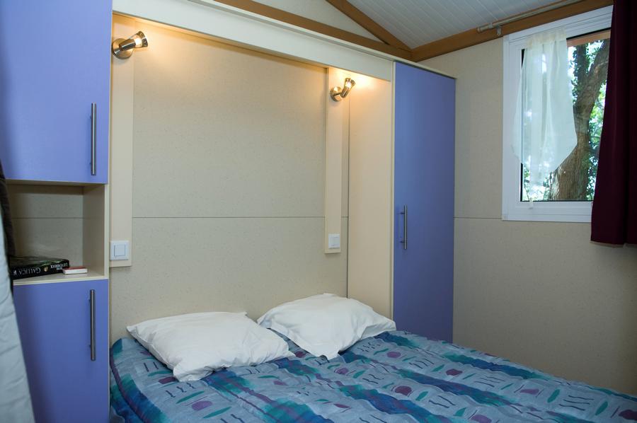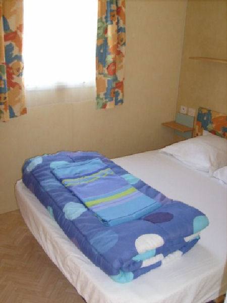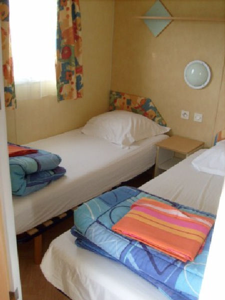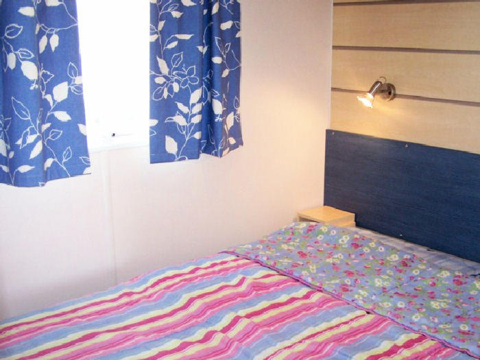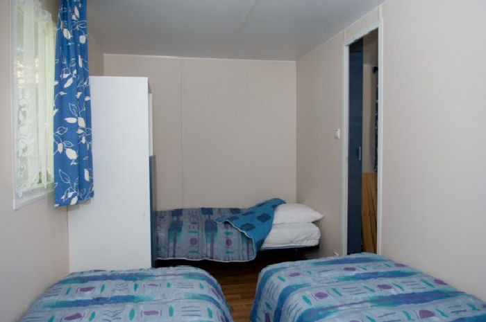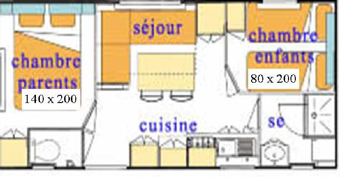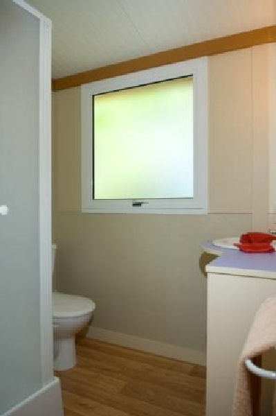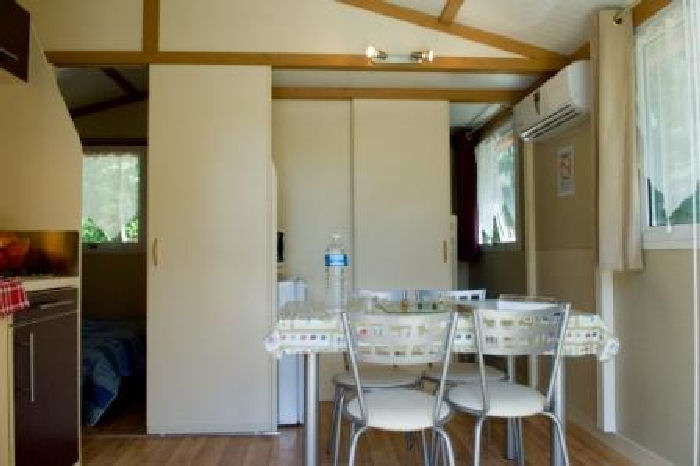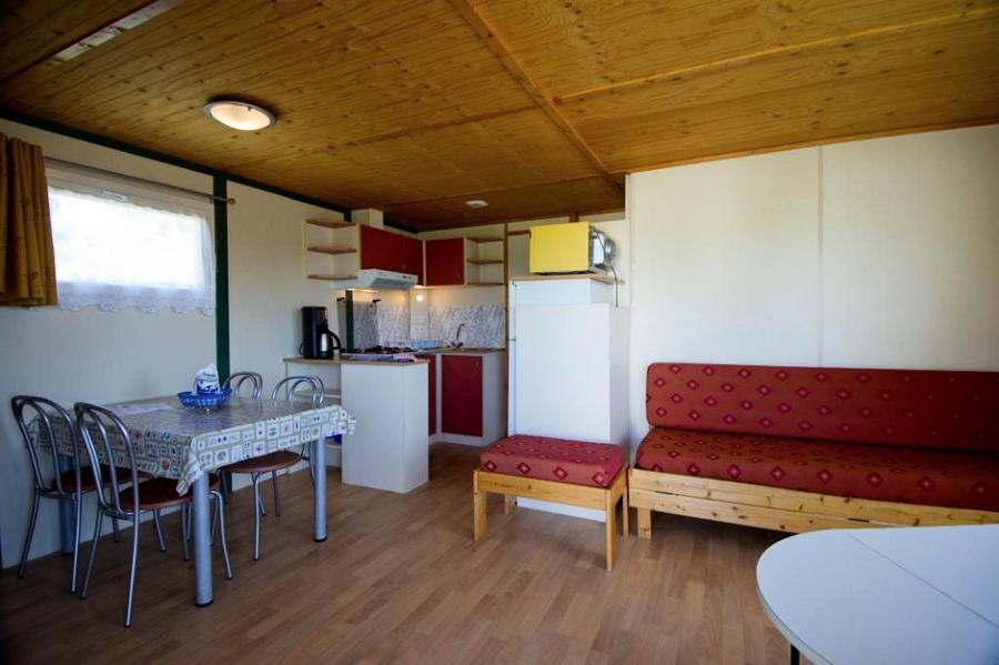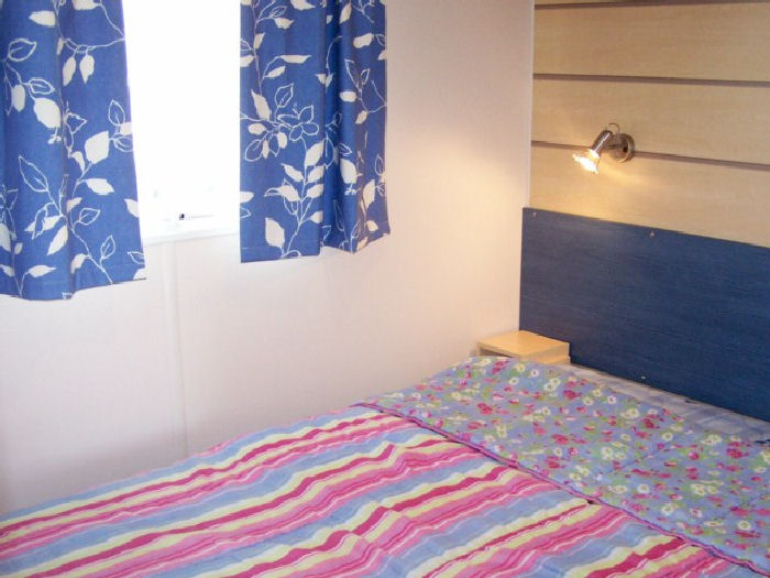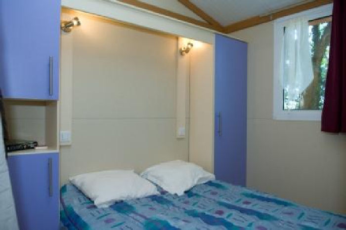 Chalet de 20m² pour 4 personnes, composé d'un coin cuisine équipé, d'un séjour avec coin repas, d'une chambre avec un lit double, d'une chambre avec 2 lits superposés, d'une salle de bains avec une douche et un WC et d'une terrasse.Ancienneté : 2008.