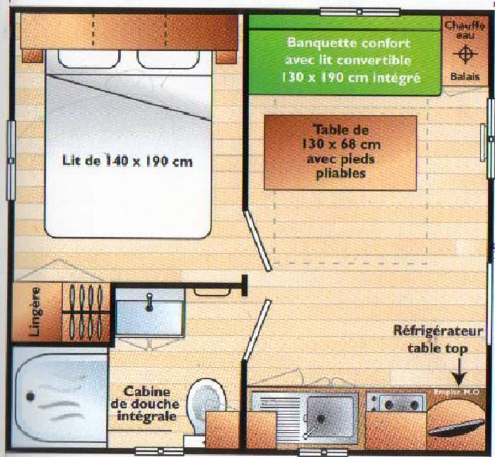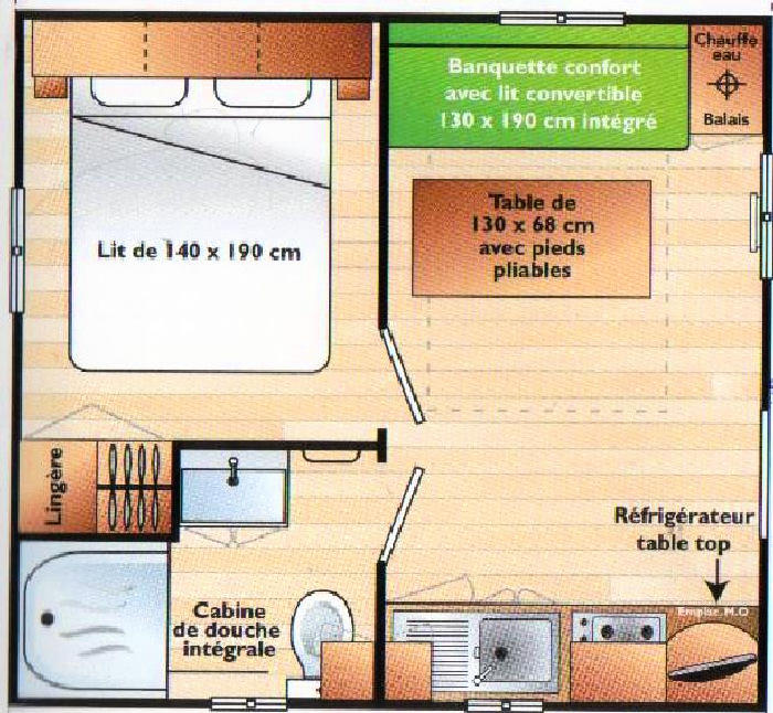 Cottage de 17m² pour 2 personnes, composé d'un coin cuisine équipé, d'un séjour avec coin repas, d'une chambre avec un lit double, d'une salle de bains avec une douche et un WC et d'une terrasse.Ancienneté : 2008.
