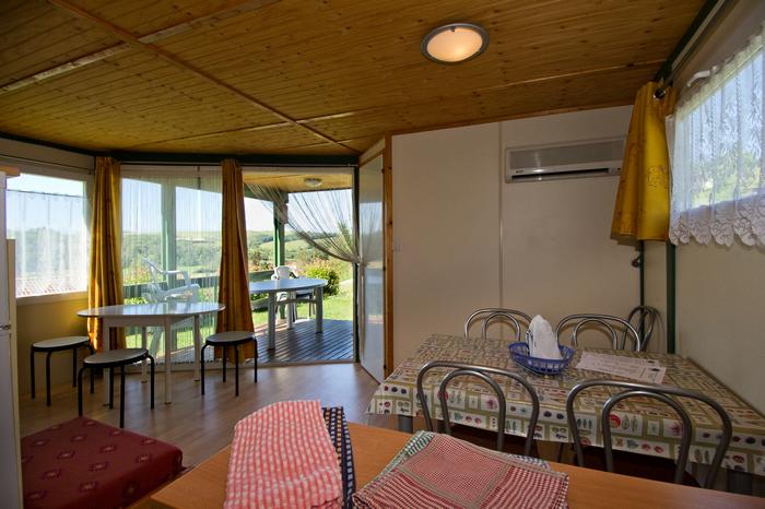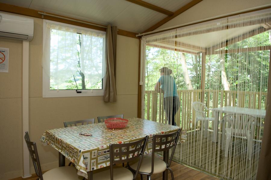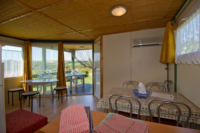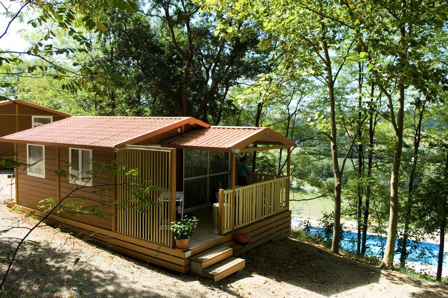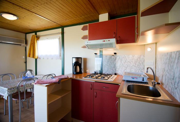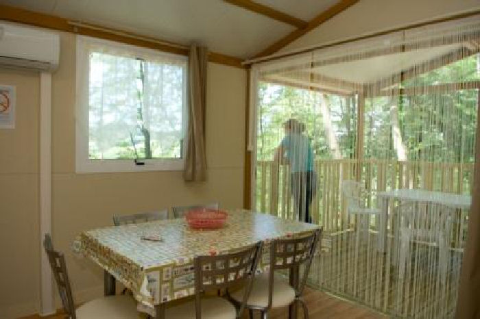 Chalet de 24m² pour 5 personnes, composé d'un coin cuisine équipé, d'un séjour avec coin repas, d'une chambre avec un lit double, d'une chambre avec 2 lits superposés et un lit simple, d'une salle de bains avec une douche et un WC et d'une terrasse.