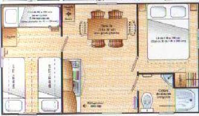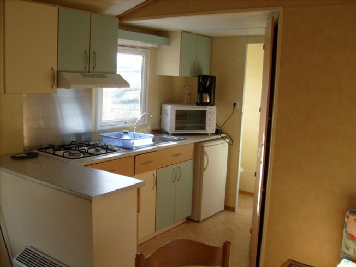 Cottage de 21m² pour 4 personnes, composé d'un coin cuisine équipé, d'un séjour avec coin repas, d'une chambre avec un lit double, d'une chambre avec 2 lits superposés, d'une salle de bains avec une douche, d'un WC et d'une terrasse.Ancienneté : 2001.