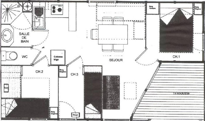 Chalet de 39m² pour 7 personnes, composé d'un coin cuisine équipé, d'un séjour avec coin repas, d'une chambre avec un lit double, d'une chambre avec 2 lits superposés, d'une chambre avec 3 lits simples, d'une salle de bains avec une douche, d'un WC séparé et d'une terrasse.Ancienneté : 2003.