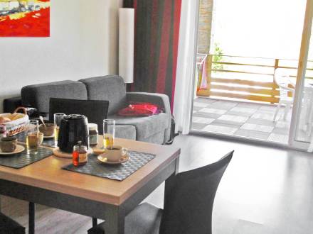 Apt 2 pièces 40 m2: séjour/salle à manger avec 1 divan-lit double et TV à louer (écran plat). 1 chambre avec 1 grand-lit. Cabine avec 1 x 2 lits superposés. Coin cuisine (lave-vaisselle, plaque vitro céramique, cafetière électrique). Bains ou douche/WC. Balcon. Mobilier de balcon.