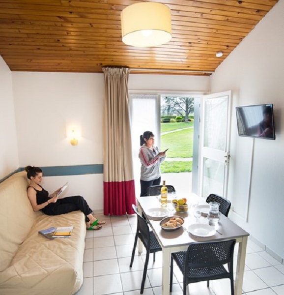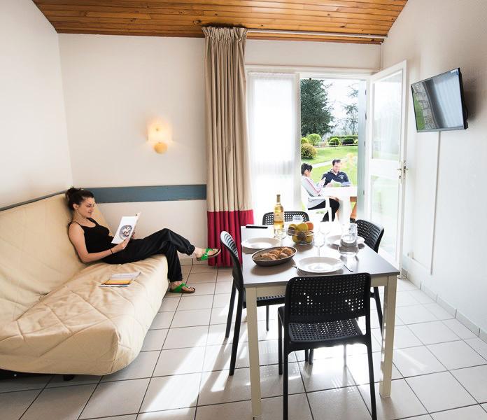 L'appartement 2 Pièces 5/6 Personnes de 33m2 se compose d'un coin cuisine entièrement équipé, d'un séjour/chambre avec un canapé-lit gigogne, 1 chambre (2 lits simples + 1 lit gigogne ou 2 x 2 lits superposés), une salle de bains avec WC et une terrasse de plain pied avec mobilier de jardin.