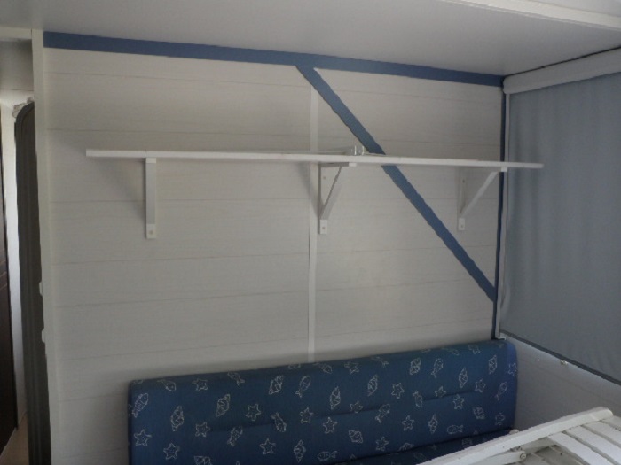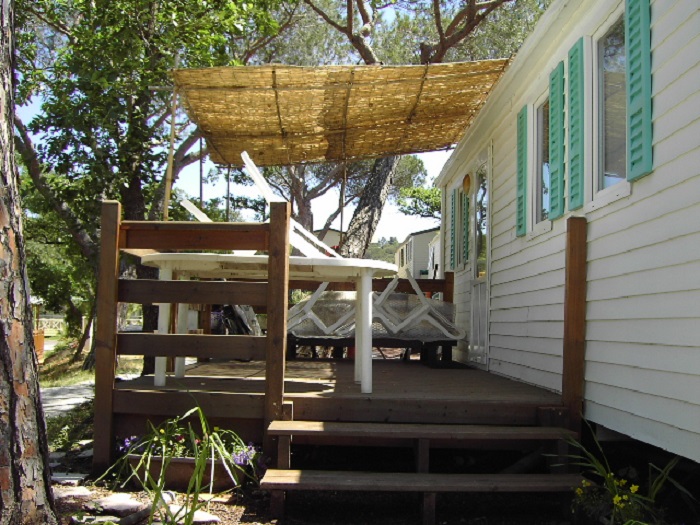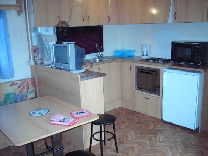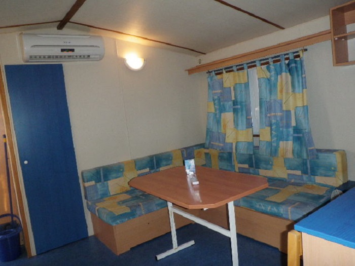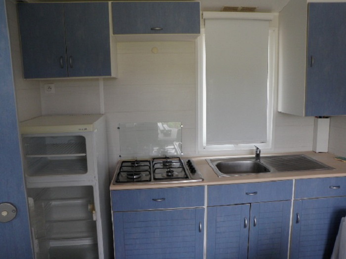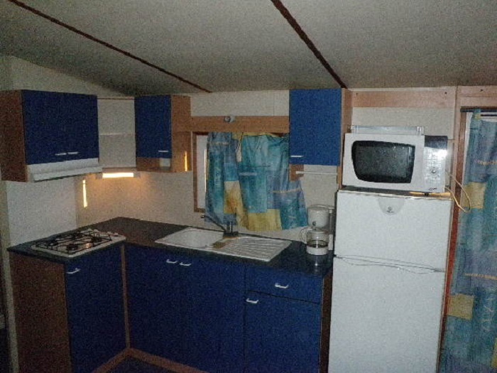 Le Mobil Home détient un coin cuisine avec réfrigérateur/congélateur, un second réfrigérateur TOP, four à micro-ondes et grill, 4 feux de cuisson à gaz.Une télévision est également disponible en supplément avec lecteur DVD.La climatisation est également disponible en supplément. La terrasse est pourvue de table et chaises en résine avec transats et parasol.
