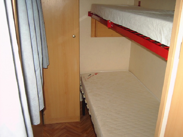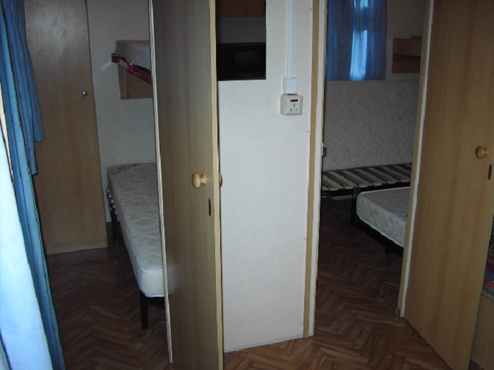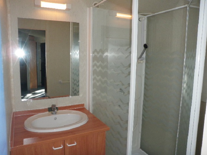 Mobil Home 3 pièces 5 personnes de 30m², composé d'un séjour avec canapé convertible (en 1 ou 2 couchage au choix), d'un coin cuisine équipé, une chambre avec 2 lits superposés et 1 lit simple, une chambre ayant 1 lit double avec sa salle de douche privative, une seconde salle de douche, WC séparé et une terrasse en bois.A noter : possibilité d'ajouter 2 personnes supplémentaires avec un supplément de 20 à 50? / personne.