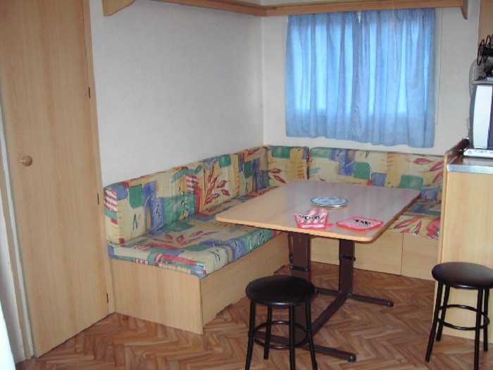 Le Mobil Home détient un coin cuisine avec réfrigérateur/congélateur, un second réfrigérateur TOP, four à micro-ondes et grill, 4 feux de cuisson à gaz.Une télévision est disponible en supplément avec lecteur DVD.La climatisation est également disponible en supplément. La terrasse est pourvue de table et chaises en résine avec transats et parasol.
