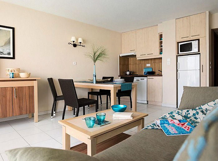 Studio avec un coin cuisine entièrement équipé de 2 ou 4 plaques électriques, d'une hotte aspirante,  d'un réfrigérateur, d'un micro-ondes ou four électrique selon les appartements, d'un lave-vaisselle et d'une cafetière électrique. Sèche-cheveux mural, télévision, téléphone (payant), coffre-fort (payant).  Balcon ou terrasse avec mobilier de jardin.