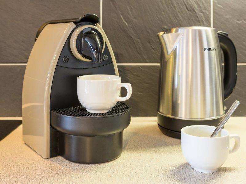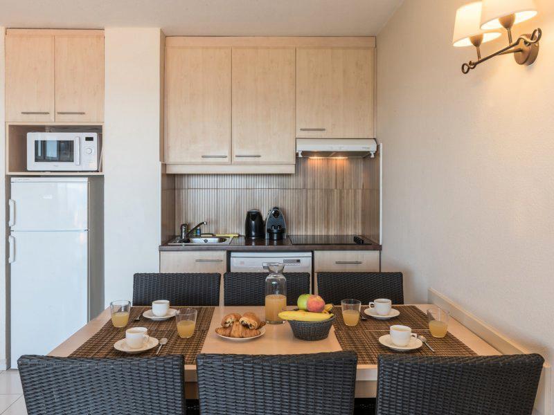 Le coin cuisine est entièrement équipé de 2 ou 4 plaques vitrocéramique, d'une hotte aspirante, d'un réfrigérateur, d'un micro-ondes ou four électrique selon les appartements, d'un lave-vaisselle et d'une cafetière électrique.