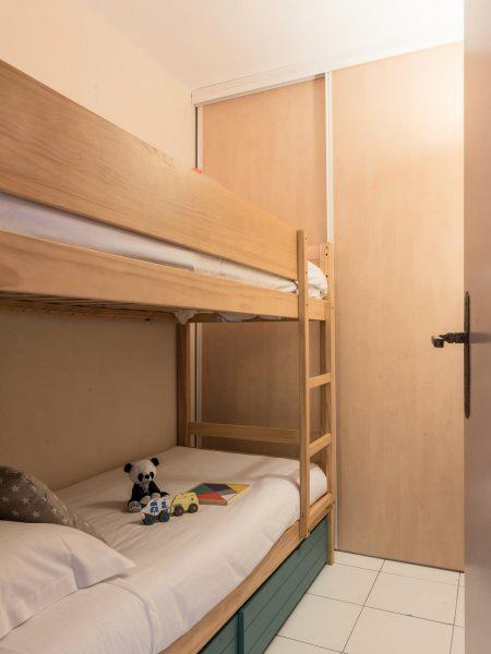 . Séjour avec 1 banquette-lit gigogne. 1 chambre avec 1 lit double et 1 cabine avec 2 lits superposés. Équipement salle de bain : 1 salle de bain