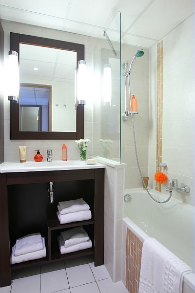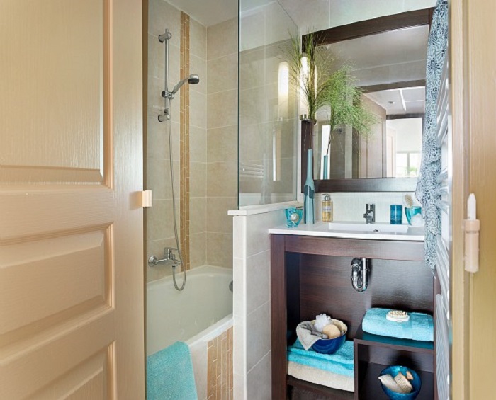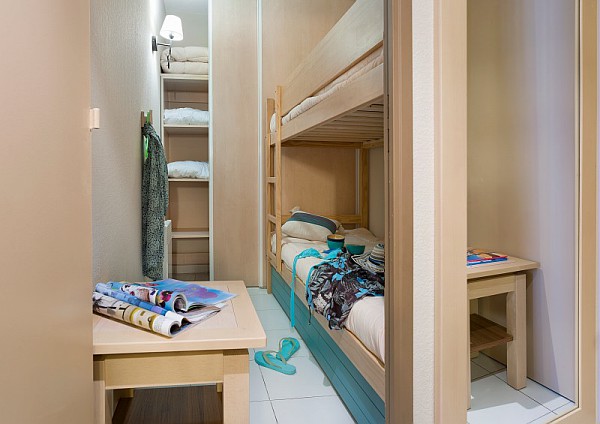 Appartement de deux à trois pièces pour cinq ou six personnes de 41 à 48m² comprenant un séjour avec un canapé convertible ou une banquette lit gigogne, une chambre avec un lit double et une cabine avec deux lits superposés ou une deuxième chambre avec deux lits jumeaux, une salle de bains et des toilettes séparés.