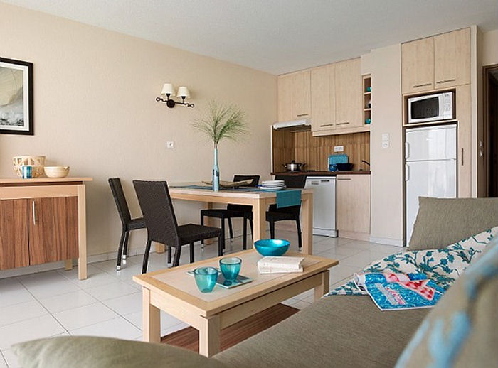 Le coin cuisine est entièrement équipé de 2 ou 4 plaques électrique, d'une hotte aspirante, d'un réfrigérateur, d'un micro-ondes ou four électrique selon les appartements, d'un lave-vaisselle et d'une cafetière électrique.Ustensiles et vaisselle pour 2 personnes.Sèche-cheveux mural, télévision, téléphone (payant), coffre-fort (payant).Balcon ou terrasse avec mobilier de jardin.